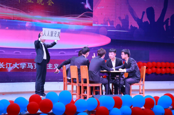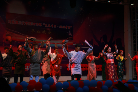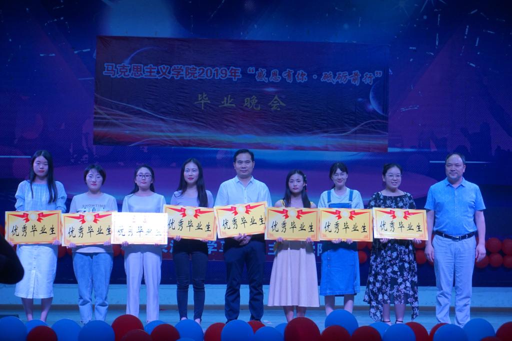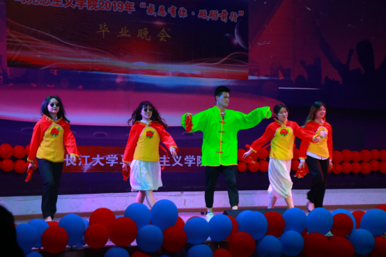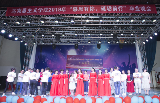 表彰大会结束后,动感火热的开场舞《DALLA DALLA》点燃了毕业晚会。《我的新衣》将现代说唱与传统京剧相融合,使人耳目一新;现代舞《pick me up》、《heart shaker》清纯可爱,活力无限;民族舞《女儿会》、《锅庄风情》柔婉袅娜、质朴潇洒,赢得现场阵阵掌声;歌曲《私奔到月球》、《不为谁而作的歌》温柔甜美、娓娓动听,让人赏心悦耳;《创意T台秀》和相声《我说了算》多元创新、包袱连连,让人忍俊不禁,掌声不断。贾廷秀教授指导的暖课作品《以青春致敬马克思》也再次搬上了毕业晚会的舞台,思政2017级的同学们用话剧的形式展现了青年马克思的雄才伟志,以及他与恩格斯的深厚友谊;肖芬蓉老师的女儿班传珮小朋友也献唱了让人倍感清新流畅的民谣《卢沟谣》;思政11602班的朗诵《不说再见》,追忆了大学时光的点点滴滴,表达了他们对学长学姐的感恩与不舍;毕业班的情景剧《长大,长大,再见》压轴出场,一幕幕情景剧记录了2019届毕业生在长大、在马院难忘的青春岁月,引发了师生强烈共鸣。最后,贾廷秀等7位yl23455永利集团教师合唱团的老师们用优美的歌声《闪亮的日子》为毕业生们送来祝福,晚会在全体教师共同演唱的《送别》中落幕。