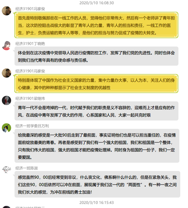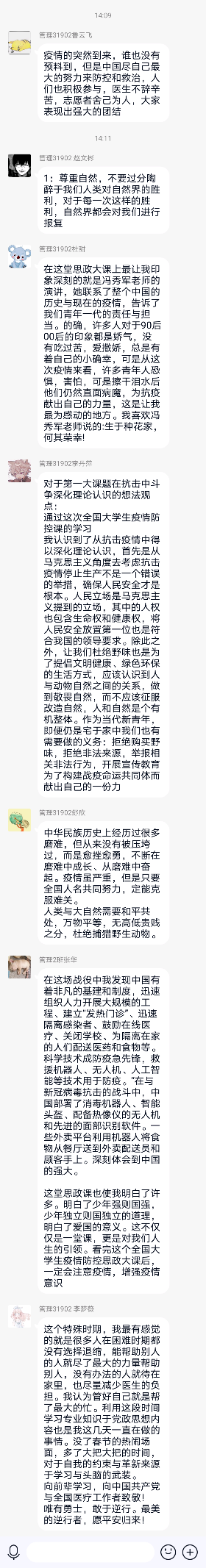 在观看了“思政大课”后,思政课教师利用上课时间,有序开展线上讨论。老师首先回顾了四位老师的讲授要点,并结合四门思政课的知识点,进行了知识拓展和主题深化。随后由同学们发表自己的感想。同学们讨论热烈,普遍表示,通过观看“思政大课”,结合自己在疫情期间的切实体验,更深刻地认识到了中国共产党的领导以及中国特色社会主义制度的充分优势,尤其是在与欧美国家的疫情表现的比较中,同学们感受到了社会主义制度的巨大优越性,中国共产党的先进性,同时也意识到了作为青年大学生,肩负着重要的责任。学生的具体反响如下: