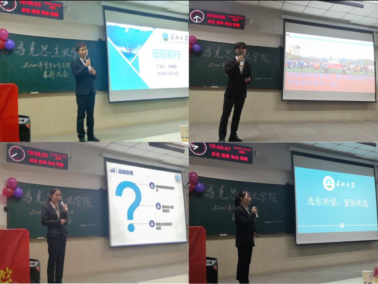会议开始,主席团成员述职。“乘风破浪会有时,直挂云帆济沧海”、“选你所爱,爱你所选”、“不忘初心,保持热情”,副主席郑国琴、莫保华、魏文婵、杨帆和崔婷依次向大家展示了分管部门在本学期所举办的活动和取得的成绩,如屈原杯朗诵比赛,“青春做脊梁,战疫勇担当”主题升旗仪式,学长学姐引领计划,学干初级培训班,无领导小组讨论比赛,寝室文化节等等。当然,在尽情向大家们展示成绩的同时,主席们也不忘向大家分享反思部门工作的不足和介绍下学期的计划目标,力争学院发展更上一层楼。