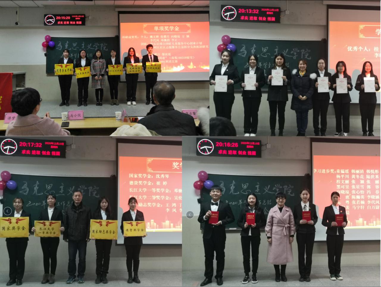 进入颁奖环节,李敏、张云雾、谭梦媛、马小佼、吴智勇分别为最佳(优秀)部门、优秀个人、单项奖学金、学生工作先进集体和个人、各类奖学金获得个人和集体颁奖,并合影留念。