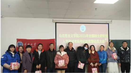 张云雾老师首先开展了考风考纪教育,她详细讲解了研究生入学考试应考防疫、进场须知和考场规则,提醒了各类考试注意事项;思政11702班班长罗金则带领同学们进行了庄严宣誓,并当场签署了诚信应考承诺书。为了进一步鼓舞士气,所有与会老师为同学们发放了“十全十美”考研加油包,其中的每样小礼物都蕴含着对同学们的真诚祝福。最后,张莉副教授、吴智勇书记以及姜学勤院长作了考研动员,鼓励大家一定要把握节奏、坚定信心、注意身体,保持良好的状态迎接新的挑战!