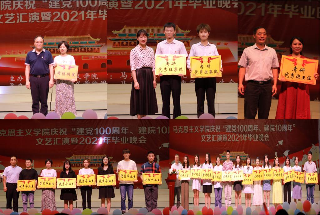 晚会首先对学院2021年考研先进集体和个人、优秀毕业生进行表彰,激励师生珍惜韶华,不负青春,锤炼本领,报效祖国。“征途漫漫,唯有奋斗”,教师代表李振华鼓舞同学们走出舒适圈,拒绝“躺平”,接续奋斗。毕业生代表罗金用“见证、成长、记忆”向大学时光告白。