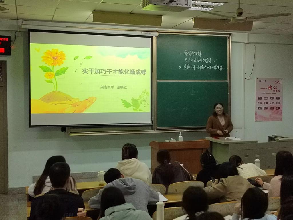 随后,张映红老师为大家带来了“巧干加实干才能化蛹成蝶”的班主任工作经验交流课。交流伊始,张老师问了大家三个关于是否准备好成为一名老师的问题,引发了大家的积极讨论,接着老师引用胡适先生的话向大家介绍了成为一名好老师的四个重点,最后张老师从认识学生、班级管理、教师角色定位、班级规章制度制定等多个方面,结合自身的经历向大家传授了自己作为班主任的宝贵工作经验,更新拓宽了同学们对当今班主任工作的理解与认知。