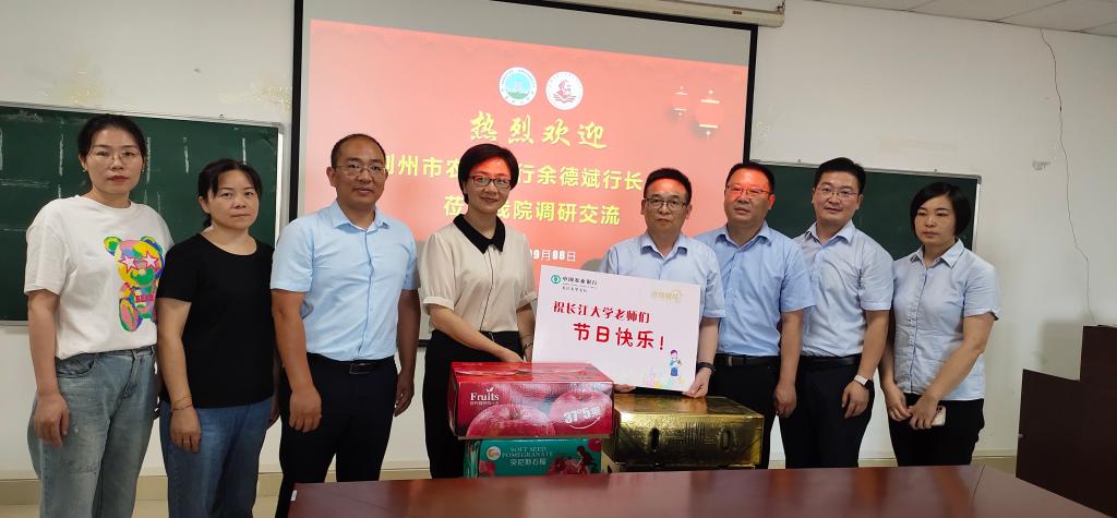 9月8日下午,农行荆州分行党委委员、副行长余德斌率机构业务部总经理黄韬、yl23455永利集团支行行长张新虎、副行长严艳一行来到永利y23455,对我院教职工进行教师节慰问,同时与院党委书记刘小燕、副院长涂江波进行了座谈。