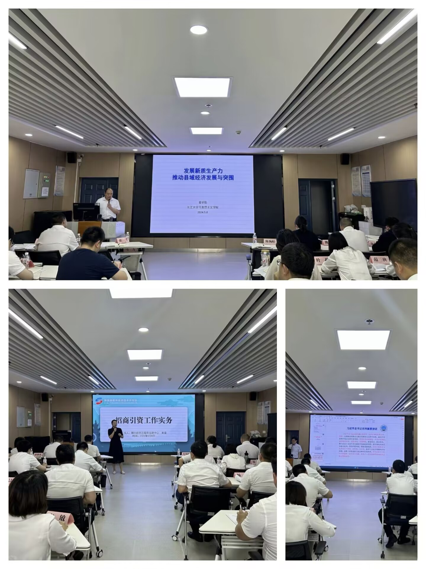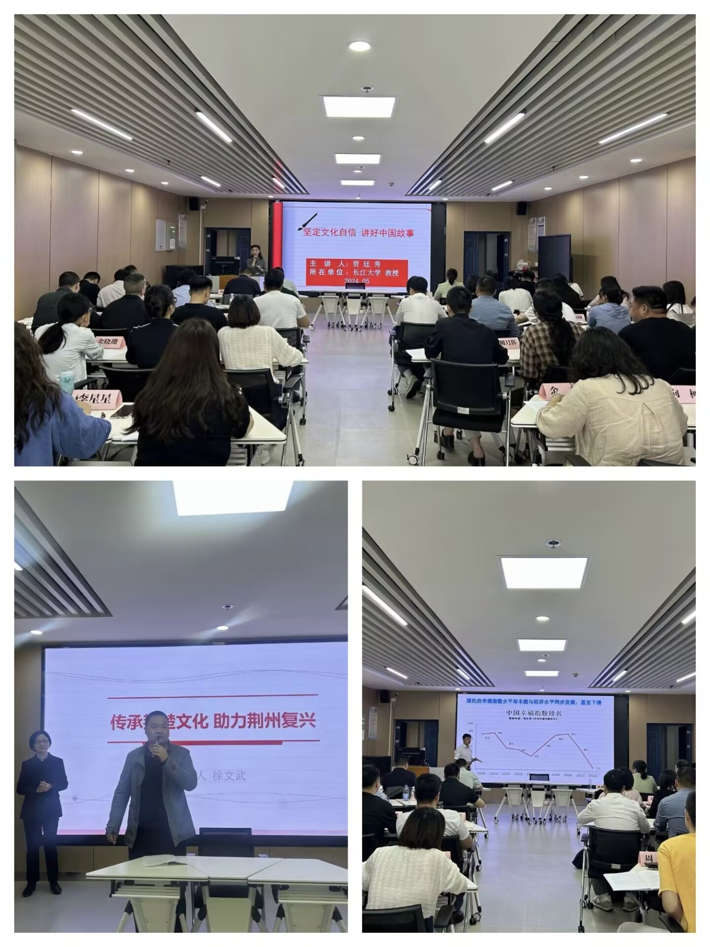 培训过程中,楚文化研究院教授徐文武以“传承荆楚文化,助力荆州复兴”为题、程坤书记以“领导干部心理调适与压力管理”为题、贾廷秀教授以“坚定文化自信,讲好中国故事”、经管学院吴雪莲教授以“培育新型农业经营主体 推进乡村振兴”为题、周中林教授的“管理沟通”、刘小燕书记以“强国建设从来不得半点虚功——习近平总书记关于力戒形式主义官僚主义论述学习体会”为题、梅平教授的“化工产业与环境保护”、姜学勤院长以“县域经济发展与突围”为题等为培训学员们带来了精彩的报告。荆州区经开区滩桥镇党委委员黄晨带来的“招商引资工作实务”以及湖北省共产党员英雄模范百封研究团队带来的情景教学互动教学:书信中的湖北精神特别让学员们印象深刻,沉浸式教学收获多感触深。
