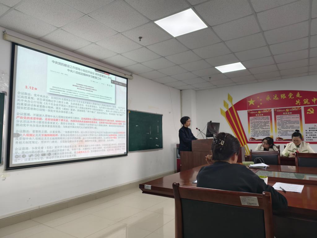 会上,学院党委书记刘小燕领学了习近平总书记关于党政机关习惯过紧日子的重要讲话和重要指示批示精神、习近平总书记关于树立和践行正确政绩观的重要论述、2024年12月9日中共中央政治局会议精神、习近平总书记在中央经济工作会议上的重要讲话精神、习近平总书记考察贵州、云南时的重要讲话精神,传达了第二十八次全国高校党的建设工作会议精神、全国两会精神、2025年全国教育工作会议精神、全省教育大会精神以及第二十八次全省高校党的建设工作会议精神,深入解读了《教育强国建设规划纲要(2024-2035年)》,并就校党委二届六次全体会议、学校2025年工作部署会、校纪委二届五次全会、学校党的建设工作领导小组会议等相关会议精神以及校纪委关于在全校范围内开展《教职工违规打牌和赌博专项整治》、《深入纠治公款旅游问题》等内容进行了集中传达。刘小燕还作了永利y23455深入贯彻中央八项规定精神学习教育部署,并讲授了以《作风建设永远在路上——深入贯彻中央八项规定精神学习教育》为题的专题党课。