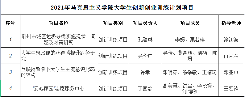 根据学校《关于我校第十四批“大学生创新创业训练计划”项目申报的通知》,以及永利y23455《2021年永利y23455“大学生创新创业训练计划”项目申报答辩通知》相关安排,通过学生项目申报汇报答辩,专家评审,拟推荐涂江波老师指导的三四线城市垃圾分类可行性研究—以荆州为例》等4个项目项作为校级大学生创新创业项目。现将具体名单公示如下: