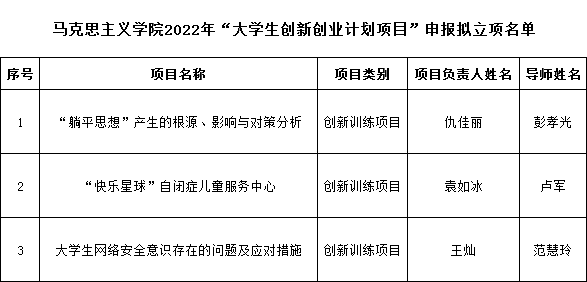 根据学校《关于我校第十五批“大学生创新创业训练计划”项目申报的通知》,以及永利y23455《2022年永利y23455“大学生创新创业训练计划”项目申报答辩通知》相关安排,通过学生项目申报汇报答辩,专家评审,拟推荐彭孝光老师指导的《“躺平”思想产生的根源、影响与对策分析》等3个项目作为校级大学生创新创业项目。具体名单见附件。