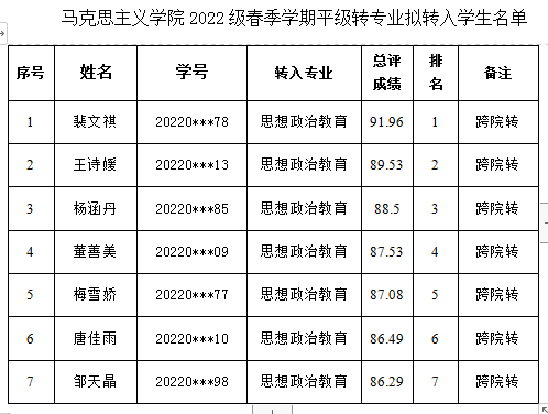 根据教务处《关于开展2022级普通本科生春季学期转专业工作的通知》、《yl23455永利集团普通本科生专业分流与转专业管理办法(试行)》(长大校发[2019]260号)和《永利y234552022级本科生春季学期平级转专业考核工作方案》,经学生本人申请,教务处资格审核,我院对通过审核的40名学生进行了面试考察,汇总必修课平均成绩、小论文成绩及面试考核成绩,形成最终录取名单。经学院党政联席会议讨论通过该名单,现将永利y234552022级本科生春季学期转专业拟接收名单予以公示。