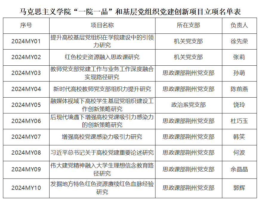 根据学校《关于申报2024年度“一院一品”和基层党组织党建创新项目的通知》要求,我院7个党支部组织推荐申报了14个党建研究项目。经学校评审,共有1个重点项目、3个一般项目获评立项。经学院党委会研究决定,将校级未立项的10个项目列为院级党建项目予以立项。现将名单公示如下: