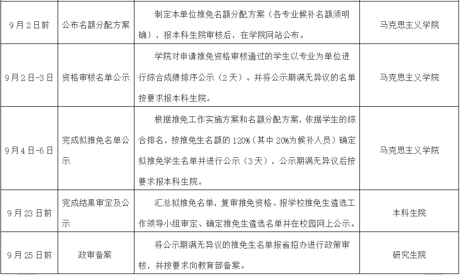 5. 推送名额。根据本单位推免工作实施方案,按综合成绩从高到低进行排名,综合成绩相同时,以学业成绩高低予以排名推荐。按分配推免生名额的120%(其中20%为候补人员)确定拟推荐学生名单进行公示。在审核、公示期间,若拟推荐推免生不符合条件或自动放弃,则依据候补人选的排名由候补人选依次递补。