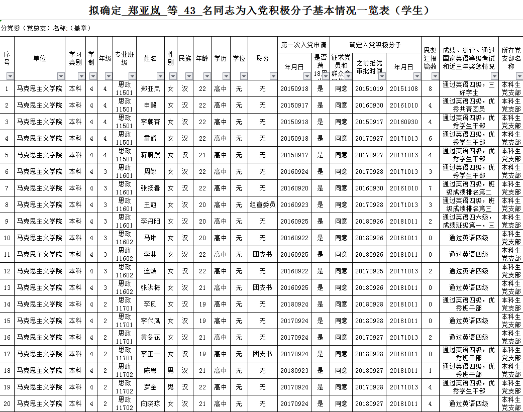 附:拟确定 郑亚岚 等 43 名同志为入党积极分子基本情况
