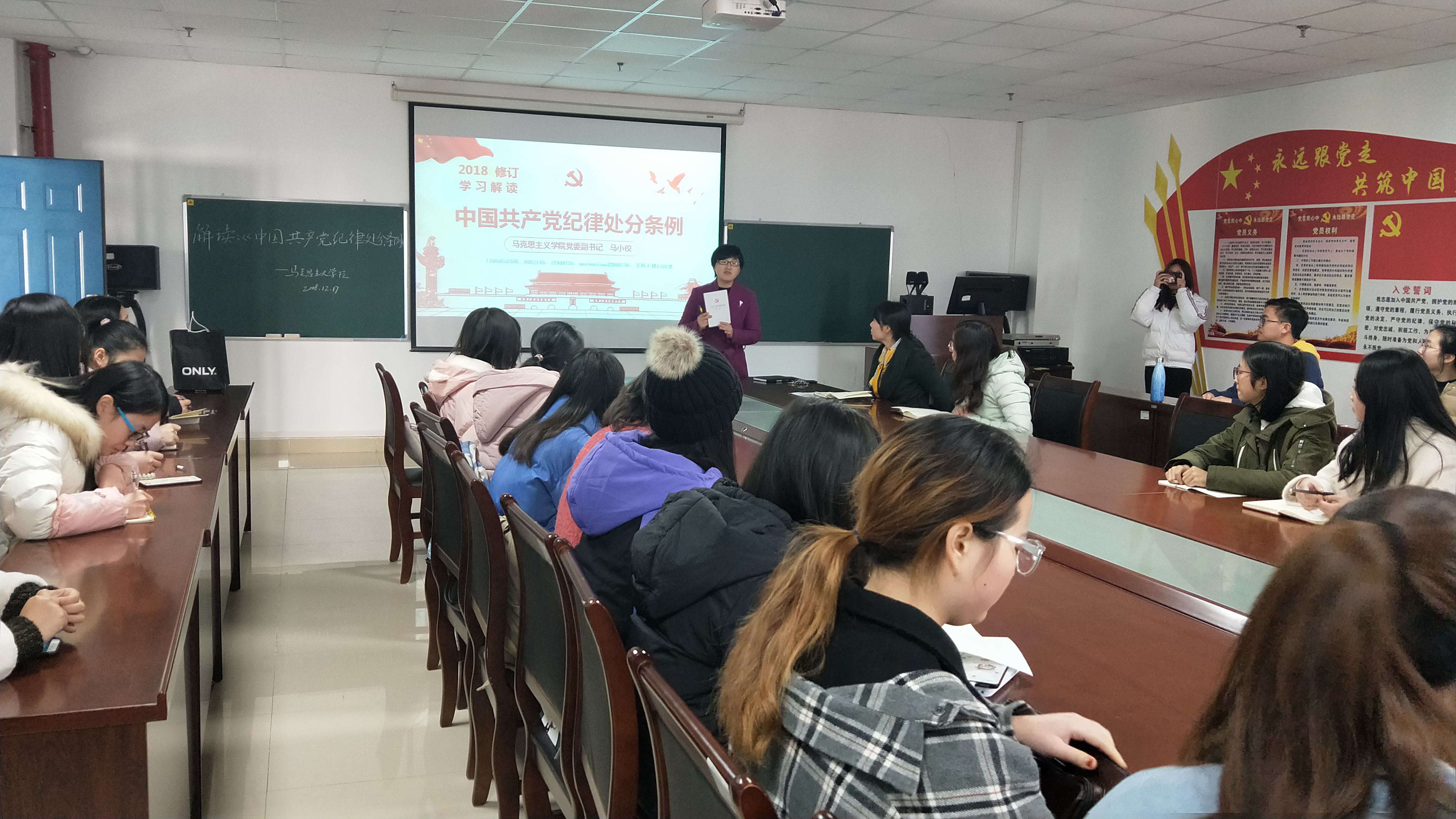 为推动新修订的《中国共产党纪律处分条例》发挥纪律建设标本兼治的利器作用,永利y23455于2018年12月17日中午12点在文科楼1104会议室召开大会,由永利y23455党委副书记马小佼为本科生全体党员、入党积极分子、学生干部讲了题为《学习解读中国共产党纪律处分条例》的主题党课,引导学生党员、入党积极分子、学生干部认真学习、深刻领会、准确把握《条例》精髓和实质。