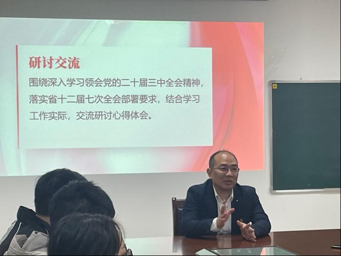 支部书记涂江波老师最后强调,全体党员要将党的二十届三中全会精神学习与自身专业结合起来,坚持理论联系实际,用全面、辩证、长远的眼光看待自身专业发展,提高对自身的要求,更加积极主动地在日常生活、学业上发挥模范作用。