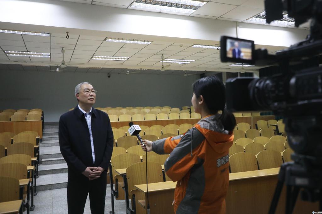 晚9时许,203教室响起热烈的掌声,《生命长江》的首堂课圆满落幕。讲授结束前,两位主讲人现场回答了同学们的提问。讲授结束后,两位主讲人还相继接受了荆州电视台记者的专访。