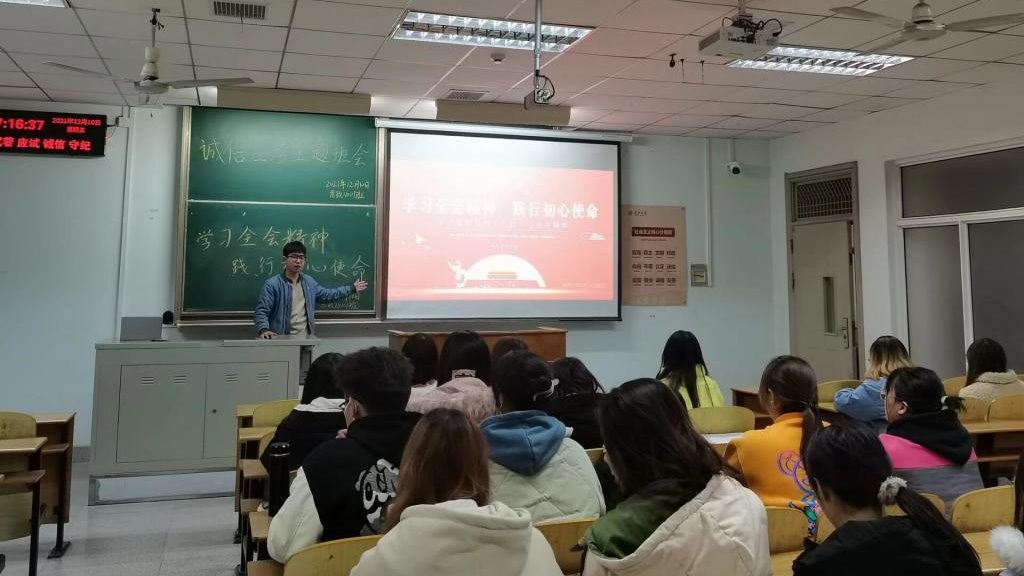 各支部围绕主题纷纷开展了“学党史,强信念,跟党走”的专题组织生活会,就“共青团员不信仰宗教”、民族团结工作和考试诚信等内容进行了主题教育活动。21级两个支部采取ppt宣讲、有奖问答等多种形式学习了十九届六中全会精神,并普及了我国关于宗教的相关政策以及法律法规;20级两个支部开展了对七一讲话精神和五四讲话精神的理论学习,倡导同学们深入实践活动;18级两个支部举行了唱团歌重温入团誓词的活动,提高了青年团员对加强民族团结工作的重要性的认识,要求团员要自觉践行爱国主义和社会主义核心价值观;研究生支部在考试诚信教育活动中提倡同学们树立诚信为本,严谨求学的态度,促进我校的学风以及校风建设。