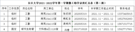 因工作需要,经学生本人申请,学院审核,现将我院2021-2022学年第二学期勤工助学拟录用名单(第二批)公示如下: