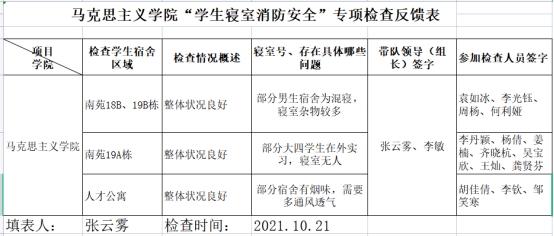 (通讯员:郜越)为了营造学生宿舍安全、卫生、整洁、健康的生活环境,2021年10月21日下午,永利y23455组织开展了冬季学生宿舍消防安全检查。本次检查由年级辅导员张云雾、李敏老师带队,学生会和研究生会生活部及部分寝室长参与了自查。本次消防安全检查覆盖了全院本、研学生寝室。
