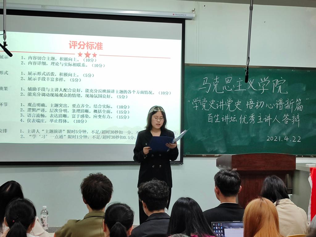(通讯员 李春燕)学党史讲党史,悟初心谱新篇。 4月22日19:00,永利y23455“百生讲坛”优秀主讲人答辩活动于13教A203举行。本次活动邀请辅导员李敏、团委学生会主席李懿宸、副主席魏文婵、莫保华和部分部长作为嘉宾评委。大一大二全体同学参加。