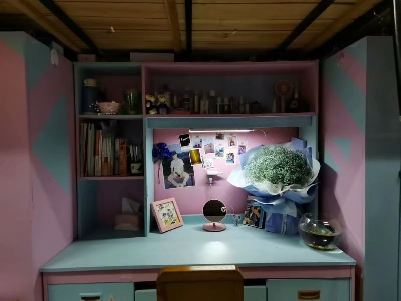 继续走进去深入探索也是惊喜连连,同学们把不大的寝室装饰的充满生活气息和人情味,行李多而不乱,寝室空气清新怡人,夹杂着淡淡的清香浸人心脾;屋顶有气球装饰、贴纸装饰和灯光装饰;墙壁被划分了绘画墙、照片墙、安全墙和留言墙等区域;桌面床铺有玩偶、鲜花、收藏品和时令水果装饰,搭配桌布温柔的台灯灯光使人心情愉悦,清爽又养眼;书架上摆着的《共产党宣言》《习近平谈治国理政》满满都是永利y23455的浓厚文化学术氛围。