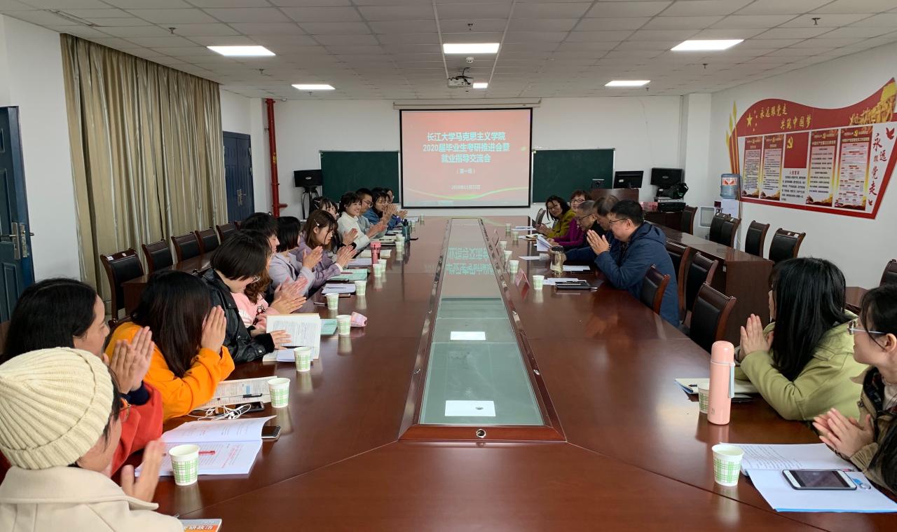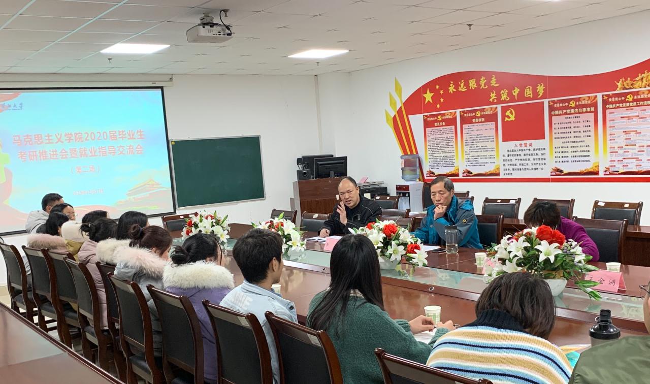 11月22日和27日下午2:30,永利y234552020届毕业生考研推进会暨就业指导交流会第一场和第二场在文科大楼1104会议室有序开展。学院院长姜学勤、党委书记吴智勇、党委副书记马小佼、教授王金洲、院长助理兼思政11602班班主任谷军、思政11601班班主任邓亚中、青年博士张莉及全体本科毕业生参加了交流会。