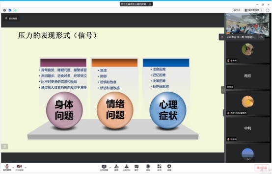 讲座中,张老师首先让同学们以小组为单位交流讨论“你的压力来自哪些方面?”一些同学表示来自于繁重的学习任务;还有一些同学认为来自于情感与生活的琐事。张老师就此提出:“压力的前提是环境的刺激。”并从认识、评估、应对压力三方面以感受、评价为线索,对当代大学生的压力问题进行系统的阐述。