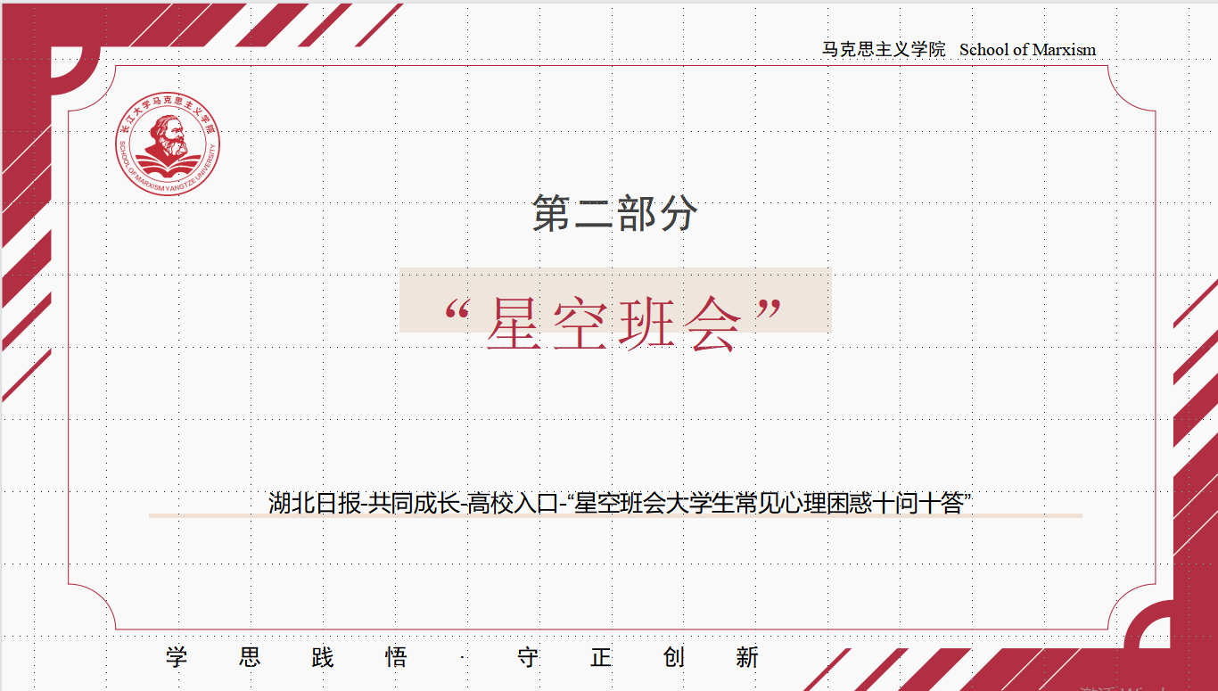 “星空班会”是湖北日报发起的以“新时代共同成长”为主题针对大学生心理健康知识科普。各班级将“星空班会”与心理健康教育主题班会相结合,以集中学习和个人自学相结合的方式开展。