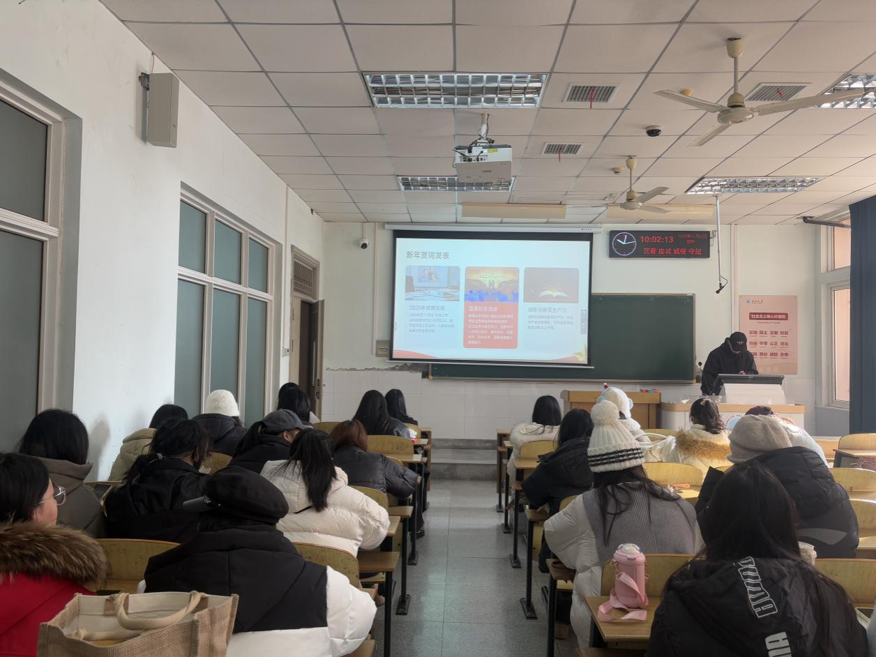 蔡坤鹏同学围绕五大核心专题,系统解读了习近平主席二〇二六年新年贺词、中央经济工作会议精神等重要内容。他回顾了2025年我国经济总量达140万亿元的辉煌成就,深入阐释了“十五五”开局之年推动高质量发展的总体要求,并详细讲解了“三农”工作、扩大内需战略以及党的二十届四中全会精神,帮助同学们准确把握国家发展大局和政策导向。 倪小艳同学聚焦教育强国建设,介绍了我国教育体系在落实立德树人根本任务、促进教育公平与普惠等方面取得的显著成效,并深入解读了“十五五”时期教育改革的重点任务。结合湖北省委十二届十一次全会精神,她分析了湖北省当前“四期叠加”的阶段性特征和加快建设全国构建新发展格局战略支点的目标,同时分享了学校服务区域高质量发展的相关规划,并强调了加强党风廉政建设的重要意义。 邹玲君同学补充领学了中共中央政治局民主生活会和湖北省科技创新大会精神,重点阐释了对党忠诚、担当作为等政治要求,系统介绍了湖北省打造科技创新“四大高地”的战略部署,以及深化高等教育综合改革的具体举措,引导同学们将个人成长融入国家和地方创新驱动发展的大局之中。