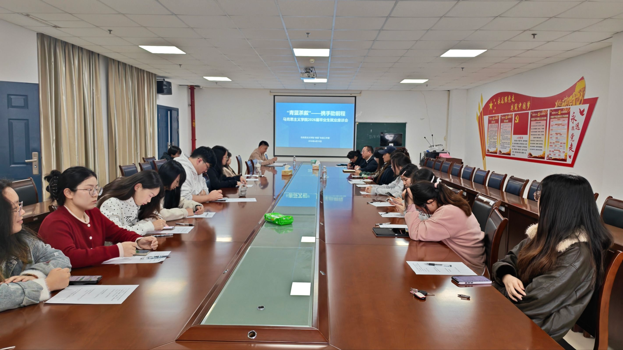 (通讯员 夏宇靓/文 丁靖易 阳玉莹/摄)为全面掌握毕业生就业动态,精准解决就业难题,4月10日下午,永利y23455在文科楼1104室召开2026届毕业生就业座谈会。学院党委副书记竺正海、学工办主任张云雾、就业专干邓鹏及部分2026届毕业生代表参加会议。
