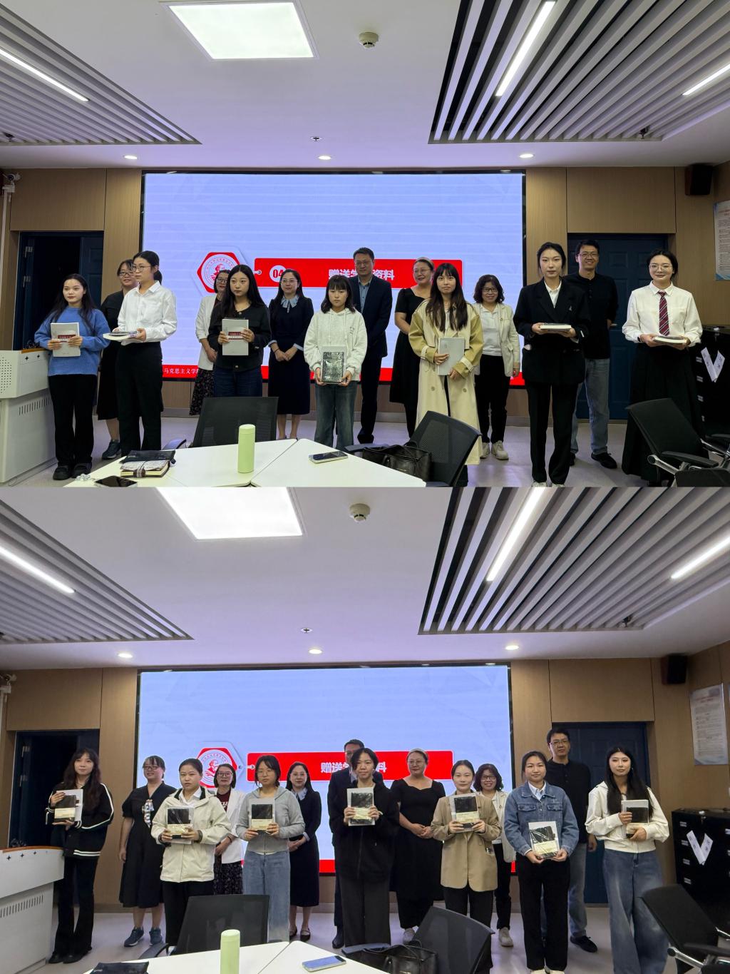 会上,导师团队为新生赠送马克思主义经典学习书籍和笔记本,并与研究生合影留念。