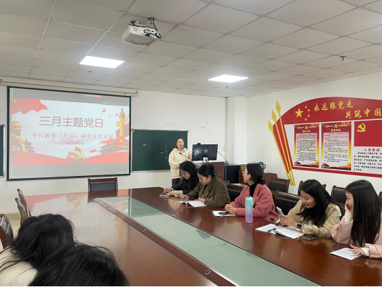 (通讯员 石秋月)为深入贯彻落实习近平新时代中国特色社会主义思想,引导广大党员坚定不移听党话,矢志不渝跟党走,增强党员的责任感与使命感。3月21日,学科教学(思政)研究生党支部在文科楼1104室开展三月主题党日活动,全体党员以及入党积极分子以线上线下相结合的方式参会。